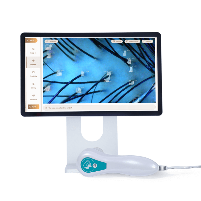 These are earier AI hair analyzer do not famous because mainly for hair salon branches use. And the handle and machine appearance do not making new model. But the machine function and quality all good. If have limit budget and want really good AI scalp analyzer, this would be the first recommendation. 15 million pixel and two camera scope. Support white light, polarized light and UV light. Each report giving detecting principle and technique application. AI automatic mark hair density, hair follicle and all relative issue. Above machine can not do that perfect as this one.