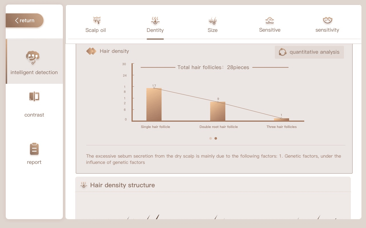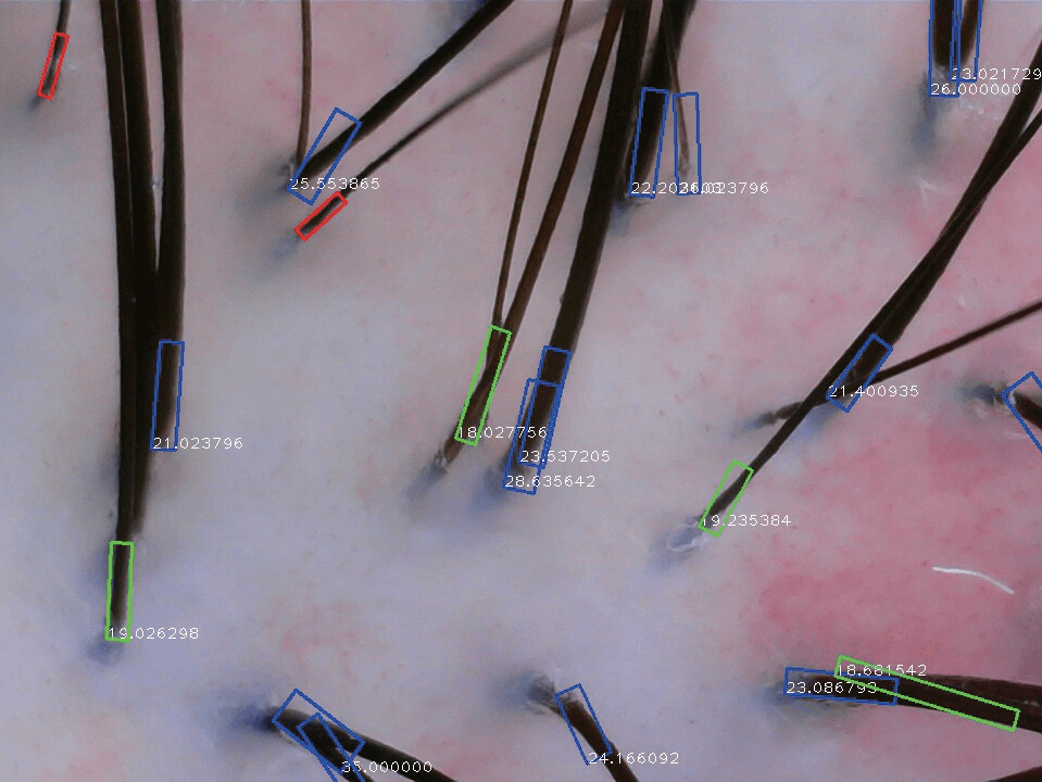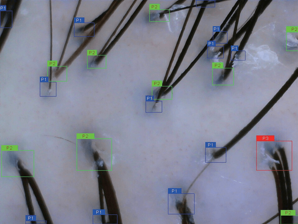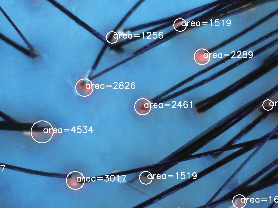 After capturing image will enter automatic analysis by AI (Artificial intelligence) technique. Such as hair density will mark and calculate hair follicle number and hair quantity under each hair follicle to get accurate hair density date. Sensitivity according to blood vessel and redness under scalp dermis situation and scanning date by sensor to giving report.