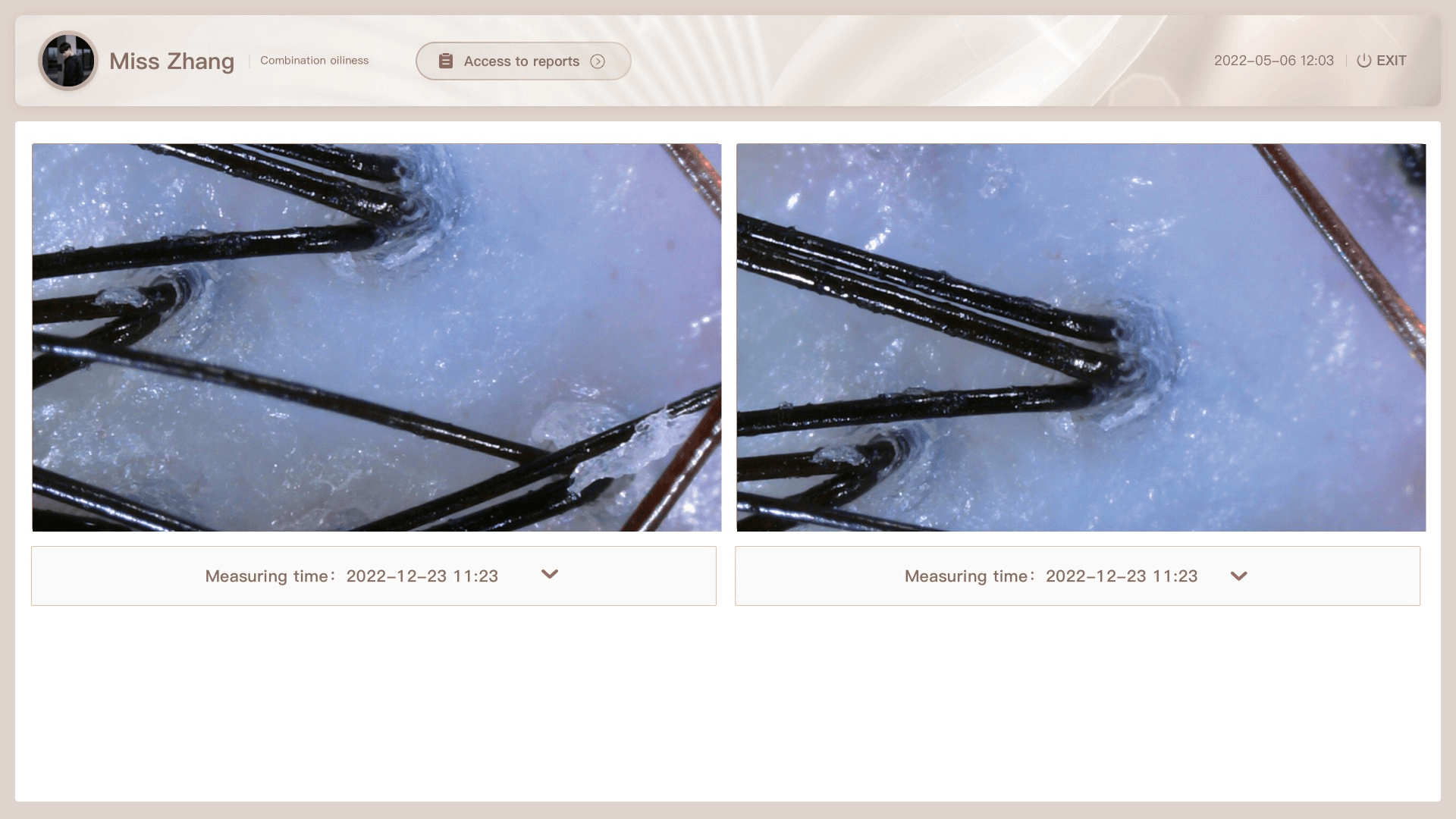 AI automatic hair scalp analysis could almost arrive 100% accurate. One handle with two camera, 50X and 200X. Comparing with portable scalp analyzer connect with phone or tablet use. The AI hair analyzer giving more accurate and full report. The sensor could scanning and recognize each single hair follicle and hair number on each port. Also could detected the oilly and redness by spectroscopy and AI algorithm. If machine without iclound and AI training could not do that. Because each clients scalp situation different, database only save standard image for compare, not real-time detection. That’s the reason almost without hair scalp analyzer machine provide report before AI been popular using.