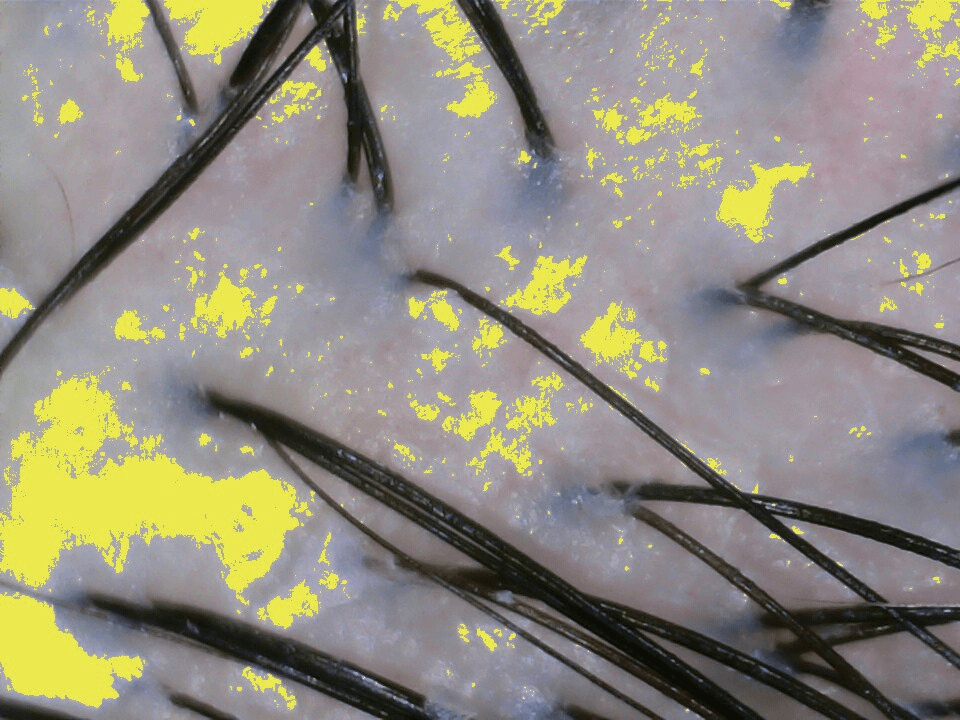 The yellow area map obtained by combining RGB spectrum and AI algorithm. Fill the reflective area of scalp grease.Fill in yellow. It can better observe the degree of greasy scalp