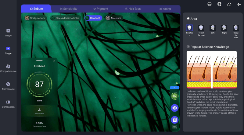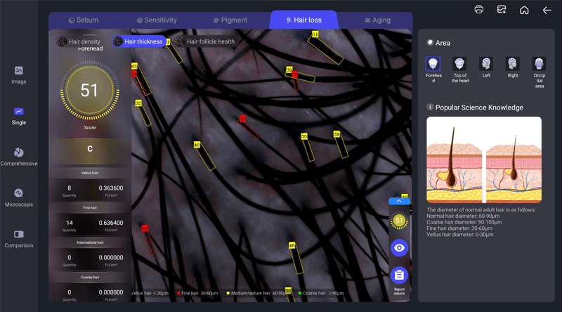 Hair analyzer AI machine using high capacity and speed iclound services to train AI model. Which making machine have huge and fast calculation to giving accaurate report. Until 2025, almost all hair and scalp problem could be detected by AI techniue. It is huge upgrade basic on traditional hair scope only enlarge skin and scalp image.
