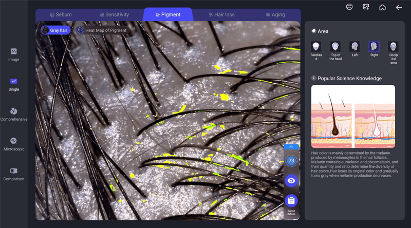 It is use for hair melanin detecting. hair melain marked by heat map. Under polarized light, red color represent white hair, yellow means brown hair, green is black and blue color means scalp.