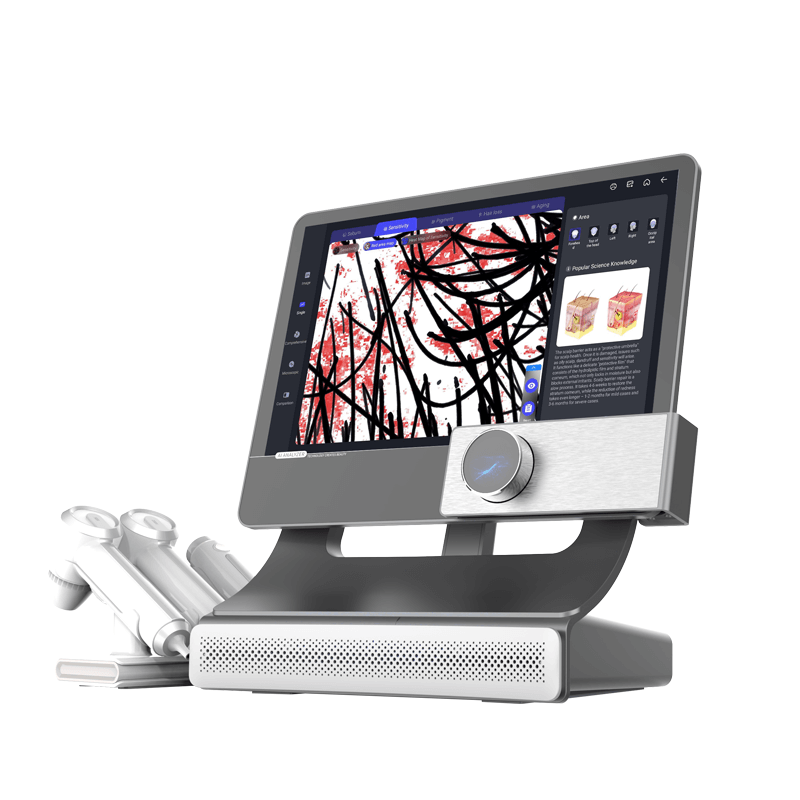 This machine using single 50X scope, 200X scope and single moisture detecting handle. Another similar AI hair analyzer use highger 15 million pixels. One detecting scope and using different locator to mark different enlarge scope 10X/20X/50X/200X. specialicon.com also provide traditional hair scope and skin analyzer. If not relative to AI training model, appearance and logo easy to do OEM.
