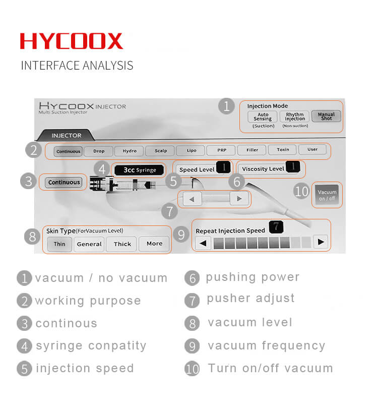 Hycoox injector is multi needle injection machine with a lot function. No matter facial or scalp injection could use it. Liquid hyaluronic acid and filler could all use. Vacuum function could turn on and off. If need multi function and doing various injection treatment could use hycoox.