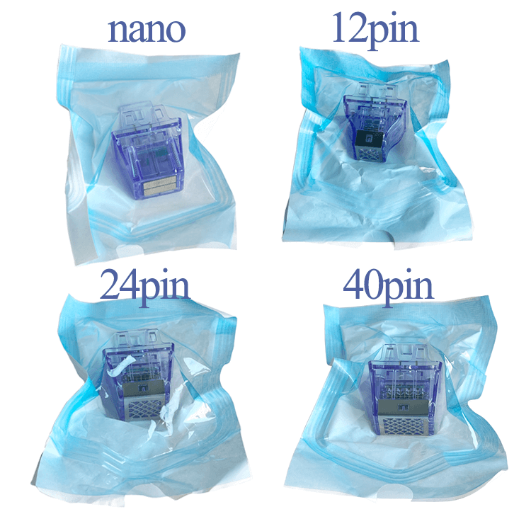 There are 4 type of needle. Nano needle do not cause skin damage. But at the same time do not coming into deep 7mm. Mostly for skin epidermis and slightly skin dermis treatment. 12pin needle for small area such as jaw and nose treatment. 24pin needle for facial use and 40pin needle for body.