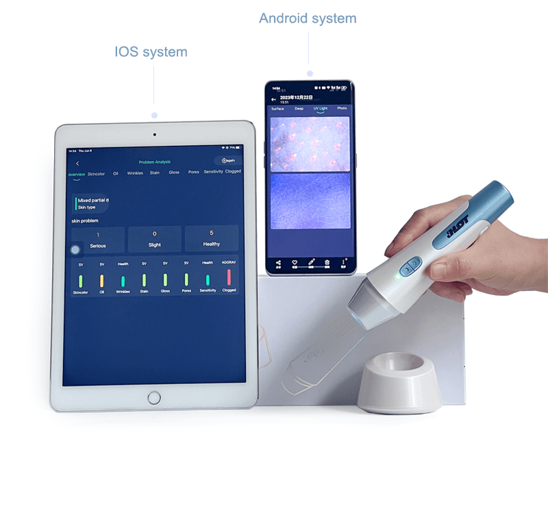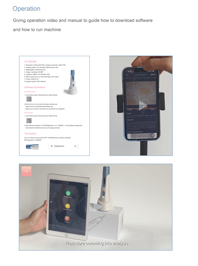 Wireless skin analysis machine SA31 special for phone and iPad usage. It is connect by WIFI so that easy carry out. Including 3 spectrum for skin epidermis, skin dermis and UV layer detecting. Machine intelligent exchanging spectrum according to detecting items. During operation just put the camera on facial according to system point out. Which means even operators without experience could easy use.
