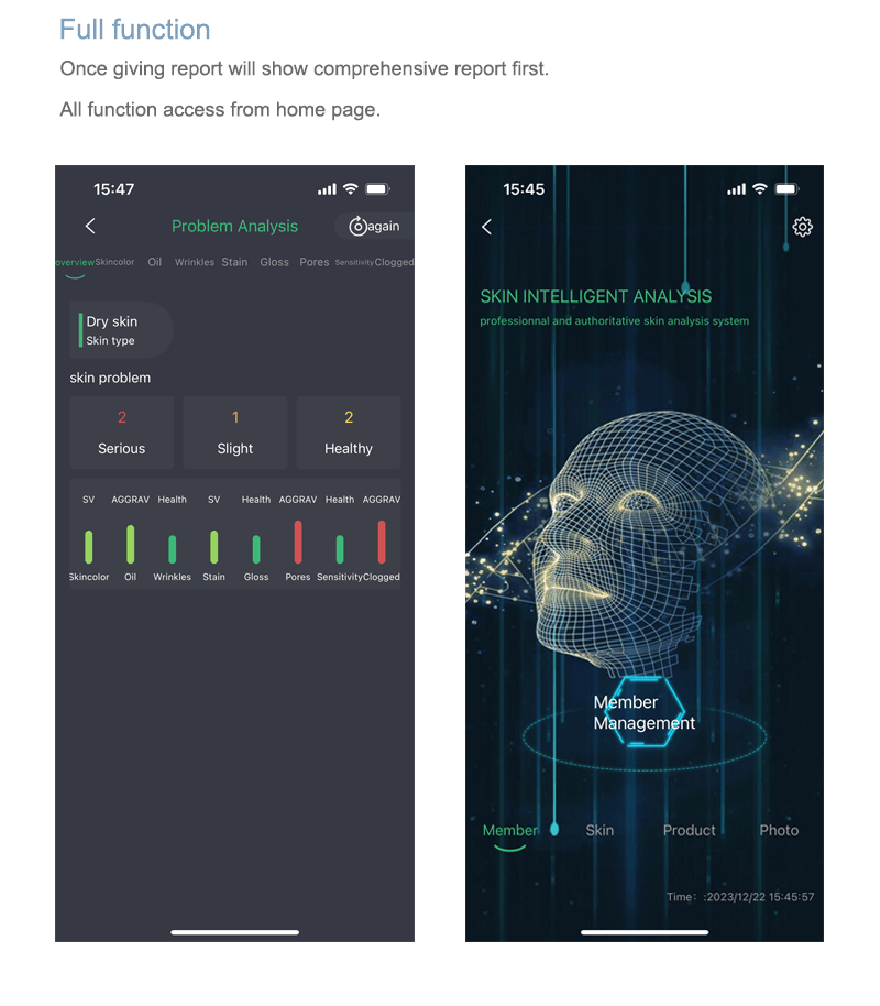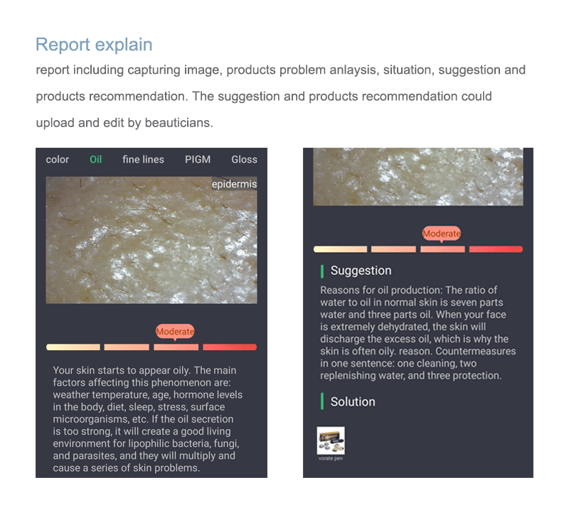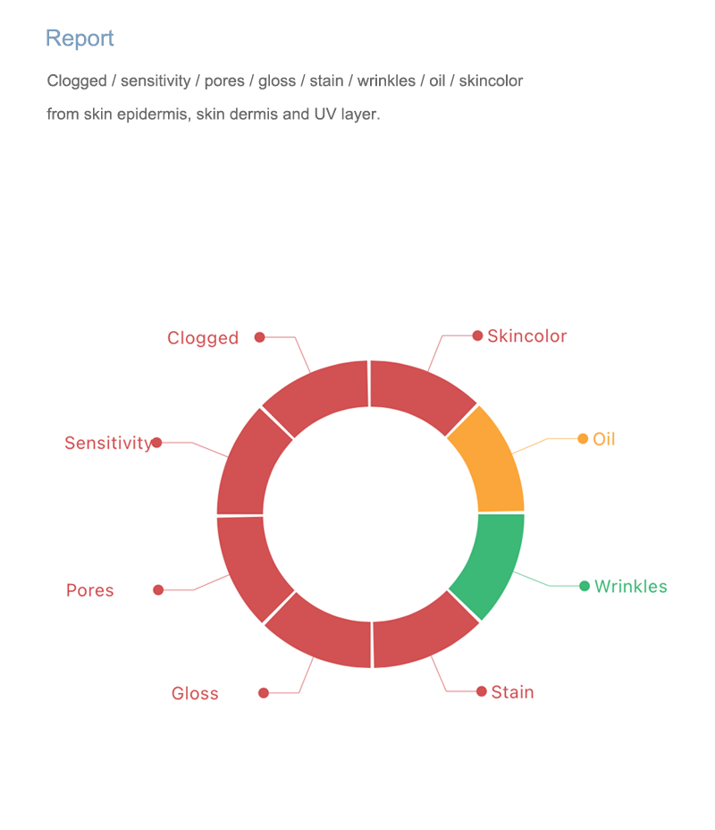 There are in total 8 report giving, including skin color, oily, wrinkle, gloss, pores, sensitivity, clogged and stain. Also giving comprehensive report for easy reading whole skin information. Each report come with scanning image, analysis image, skin situation explain and products recommendation. Comprehensive report will show all skin situation and problem in one page so that soon capturing information and doing treatment.
