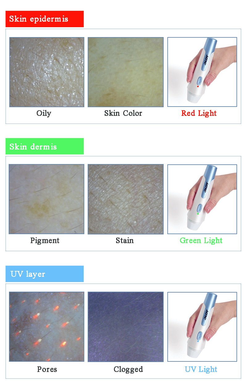 There are 3 spectrum, capturing image from skin epidermis, skin dermis and UV layer. Then the problems about oily and moistening, collagen fiber and wrinkle, pigment and skin texture, including pores stuck and acne would be found. Real image showing with detecting report together so that easy convince clients.