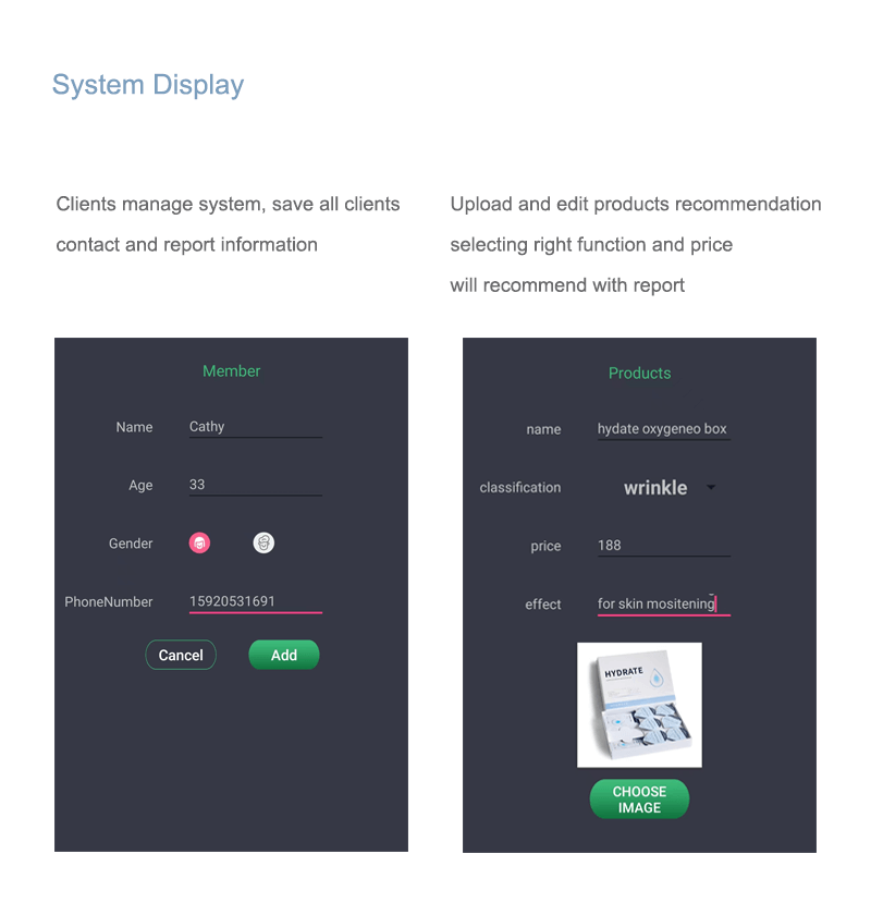 Once come to detecting should build up clients information so that report saved under right person. After they do treatment or using products to do second detecting could do before after compare. Besides, it is one of the most important function to help beauty salon get clients contact and information.